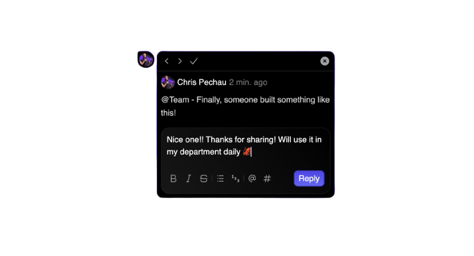 All of my departments use it daily. It's amazing! I see them sharing inspiration for new ad designs, discussing contract drafts in Google Docs, providing UI/UX feedback in our software, and offering input for the sales reps in our CRM.
